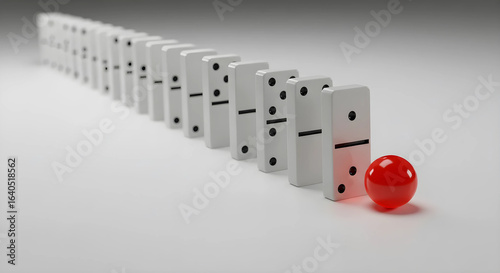 セキュリティリスクと脆弱性。赤いビー玉がドミノを倒す、サイバー攻撃とインシデント発生の危険を警告するコンセプトイメージ。