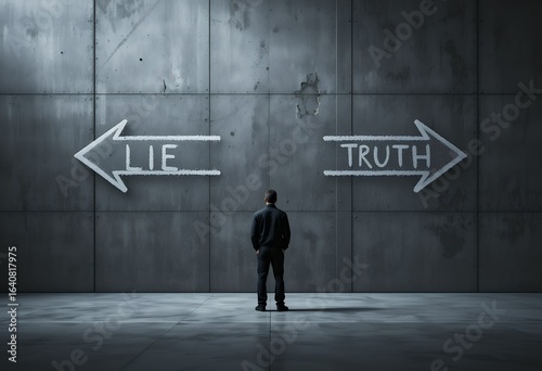 Person contemplating two opposite directions with choice between truth and lie on concrete wall