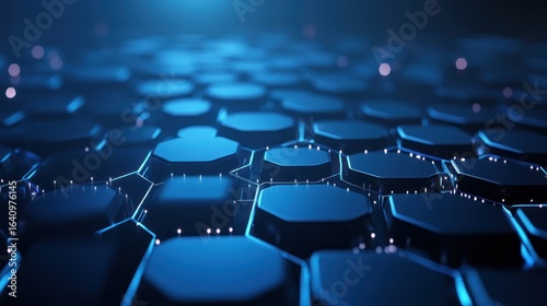 Abstract close-up view of a hexagonal grid, dark-blue, glowing, futuristic, technology, with illuminated connections