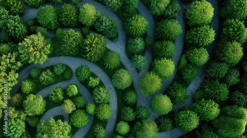 Top down aerial view of a winding path through a lush green forest park landscape with many trees and grass.