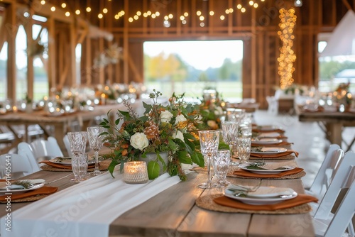 Elegant wedding reception setup with tables adorned with flowers and twinkling lights in a rustic barn setting.