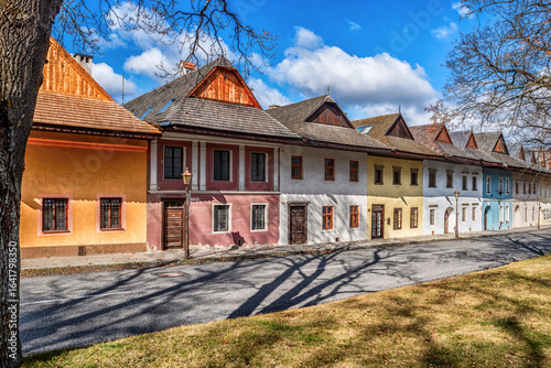 Colorful historical houses in row at Spisska Sobota district of Poprad Slovakia with blue sky and spring sunlight