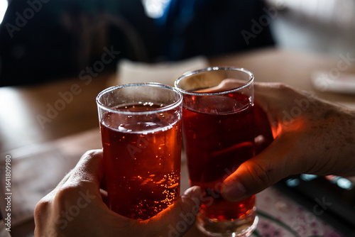 mani di due persone adulte che fanno un brindisi con dei bicchieri riempiti con bevande analcoliche di colore rosso