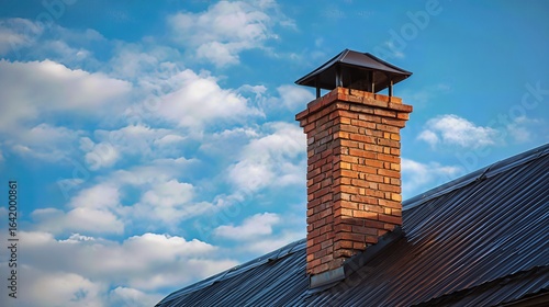 A sturdy brick chimney with two vents provides heating and ventilation, contrasting against a bright blue sky with clouds.