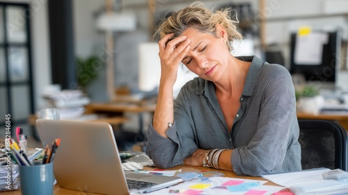 Businesswoman suffering forehead headache migraine menopause while working on laptop in office, touching her from with hand