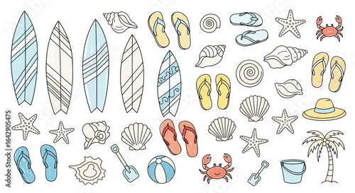 Summer Beach Doodle Icons Surfboards, Shells & More