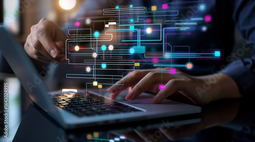 Data flow diagram. Process decomposition and data flow analysis. Engineer using laptop computer to manage data processing system
