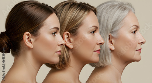 Three women with different ages are shown in a row. The first woman is a young girl with long hair, the second woman is an older woman with a more mature look