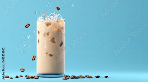Iced coffee drink in a glass with ice cubes and coffee beans.