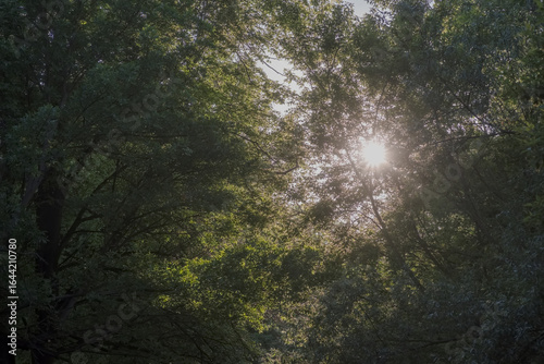Wiosenne zachodzące słońce prześwituje po południu przez gąszcz parkowych drzew. Zdjęcie ukazuje światło słoneczne przedzierające się przez gęsty baldachim drzew, prawdopodobnie po południu.