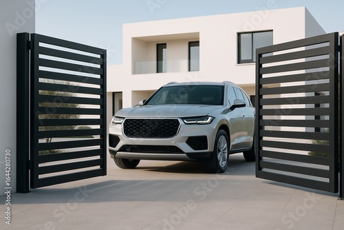 Modern car exiting contemporary home through automatic gate