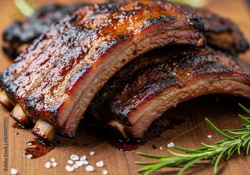 Perfekt glasierte Spareribs, angerichtet auf rustikalem Holzbrett - BBQ