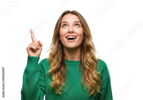 Happy woman with a sudden idea pointing up isolated on a transparent background