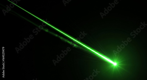 A single intense green laser beam cuts through the blackness originating from a bright concentrated point and extending diagonally upwards The light creates a visible glowing path