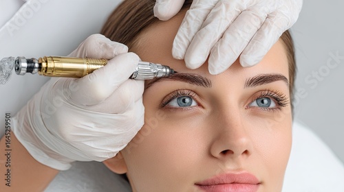 Permanent eyebrow makeup procedure with tattoo machine for perfect brows in beauty salon close-up