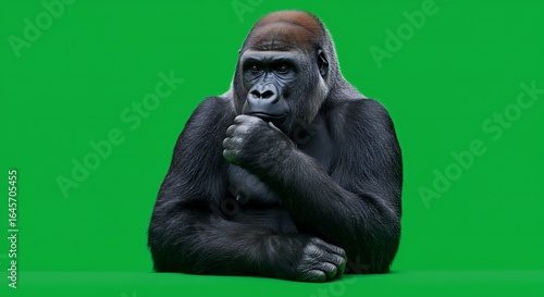 A gorilla sitting with its hand on its chin against a bright green background in a studio setting
