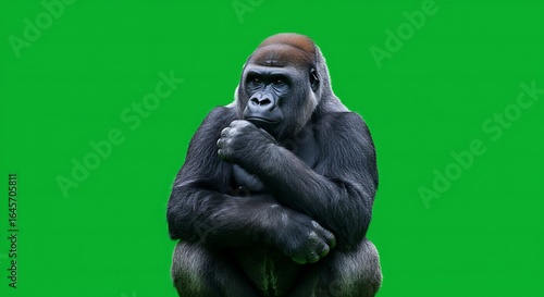 A gorilla with a thoughtful expression sitting against a bright green background in a studio setting