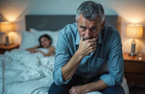 Worried mature man sits on bed, husband distressed over wife sleeping in background. Couple emotional conflict, marital problems. Late night scene in bedroom, relationship issues, sleepless night.
