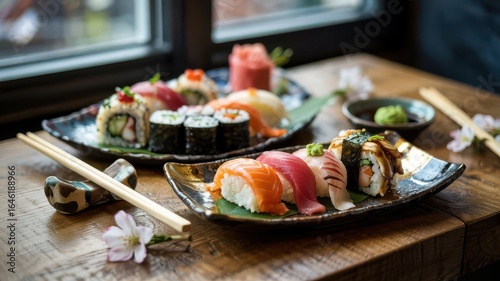 Sushi presentation featuring elegant assortment of nigiri and maki rolls arranged on dark ceramic plates with chopsticks and cherry blossoms on wooden table