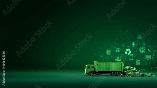 Circular Economy Concept – Waste Reduction and Sustainable Innovation, Illustration of a green garbage truck emitting waste icons against a dark background.