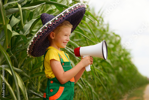 Uśmiechnięty chłopiec w kapeluszu, stoi bokiem, trzyma megafon, ubrany w strój rolnika, na tle pola kukurydzy.