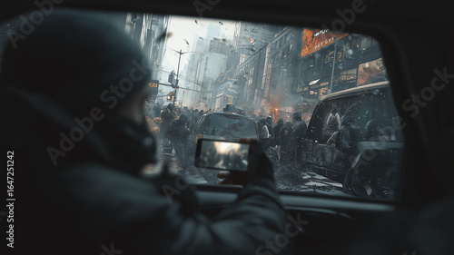 Turysta w taksówce, przez okno widzi atak terrorystyczny i napad, chaos na ulicach, krzyki, wybuchy, uchwycone dramatyczne sceny telefonem, strach i napięcie w powietrzu.