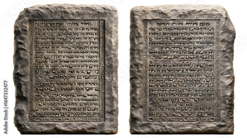 The Ten Commandments on two stone tablets, a holy artifact from the Old Testament bible, God's divine law given to Moses on Mount Sinai, a sacred symbol of faith and religion isolated on white.