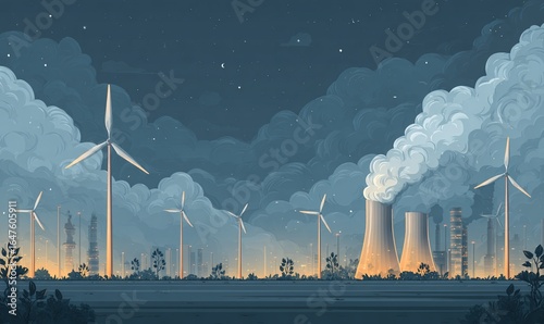 PASTELOWA NOCNA ILUSTRACJA ELEKTROWNI BIOMASOWEJ I TURBIN WIATROWYCH