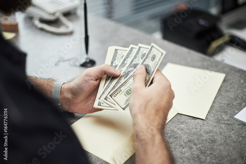Hands of unrecognizable man counting US dollar bills at bank office desk, holding cash in hands near paperwork, performing financial transaction or cash withdrawal process