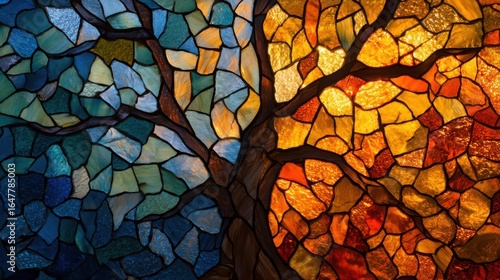 Abstract stained glass tree of life divided by contrasting colors of warm and cool tones