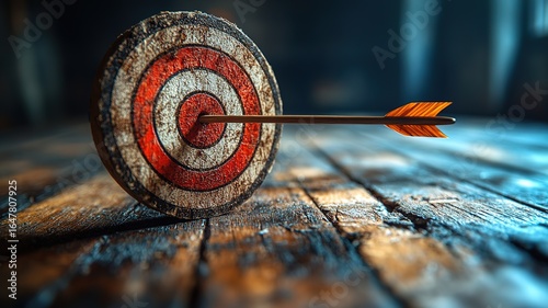 Archery Bullseye with Arrow on Textured Wood Floor, Dark Blue Background Business Precision Concept and Copy Space