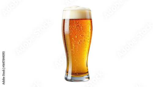 Refreshing pint of draft beer with golden amber color and frothy white foam on top, isolated on transparency background