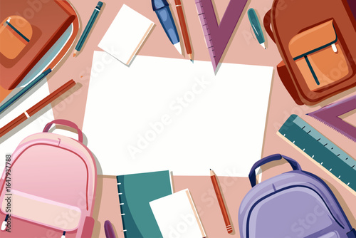 Przybory szkolne i plecaki wokół pustej kartki – kolorowa ramka z miejscem na tekst, powrót do szkoły