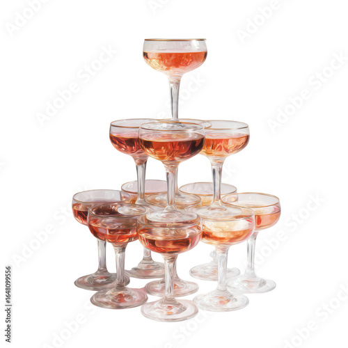 A champagne tower made of many glasses filled with rose-colored wine, png, transparent