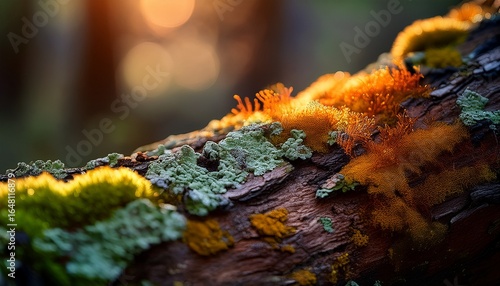tree bark with lichen and moss in macro view capturing layered texture and micro ecosystem detail