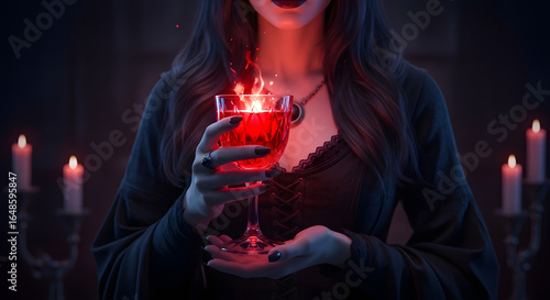 Woman in dark robe holding a goblet with red liquid and flames, surrounded by lit candles in a dimly lit room