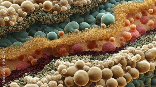 Detailed 3D illustration of a healthy gut lining layered with a diverse beneficial microbiome