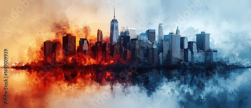 NYC Divided: A fiery cityscape meets an icy reflection, a powerful dichotomy of urban chaos and serene beauty.