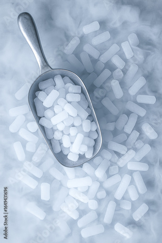 A shovel buried in dry ice cubes. Laboratory. Cryogenics. Cold and chill. Low-temperature conditions.
