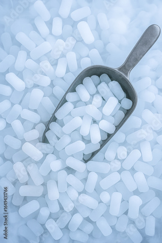 A shovel buried in dry ice cubes. Laboratory. Cryogenics. Cold and chill. Low-temperature conditions.