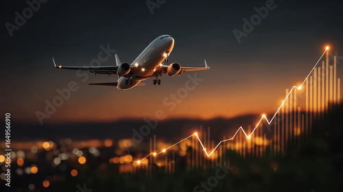 Soaring Ambitions: A commercial airplane takes flight against a backdrop of an evolving financial graph, symbolizing progress, growth, and the ascent of success.