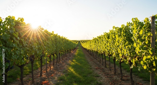 夕日輝くブドウ畑 緑葉きらめく美しい風景 自然の恵み感じる. AI Generated