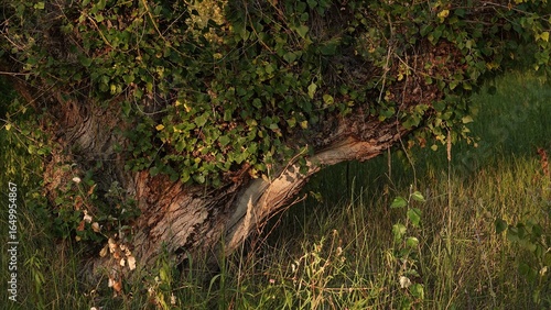 Gruby pień drzewa porośnięty porostami i pasożytami