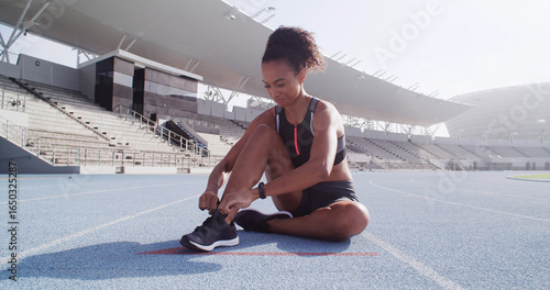 Runner, track and woman tie shoes ready for race challenge, marathon training and exercise. Sports, athlete and person with sneakers for fitness, competition and cardio workout on outdoor stadium