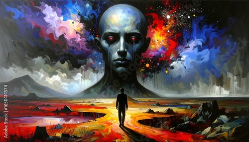 A lone figure walks toward a large, bald head emerging from a cosmic landscape