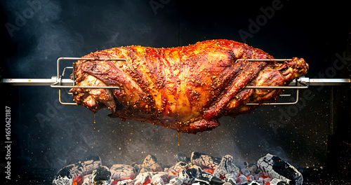 South Africa – Braai (Whole Spiced Goat). a whole goat marinated in African spices, slow-roasted on a metal spit over wood fire