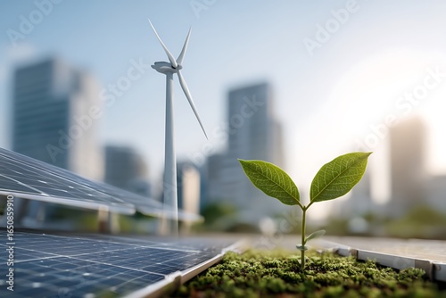 green force theme with sun collectors and blade spinner in lush urban area visual displays sprout prospering in dynamic habitat illustrating development and nature harmony
