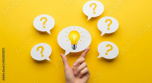 Hand holding illuminated bulb amidst question mark speech bubbles on yellow background, symbolizing problem-solving, idea generation, and finding answers