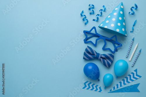 Birthday decorations with blue balloons and confetti for masculine party theme