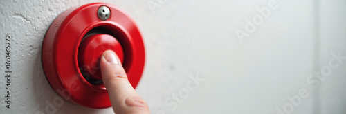 Emergency stop button with index finger pressing bright red alarm button. Emergency stop is for urgent intervention or accident prevention, used for safety in industrial settings.